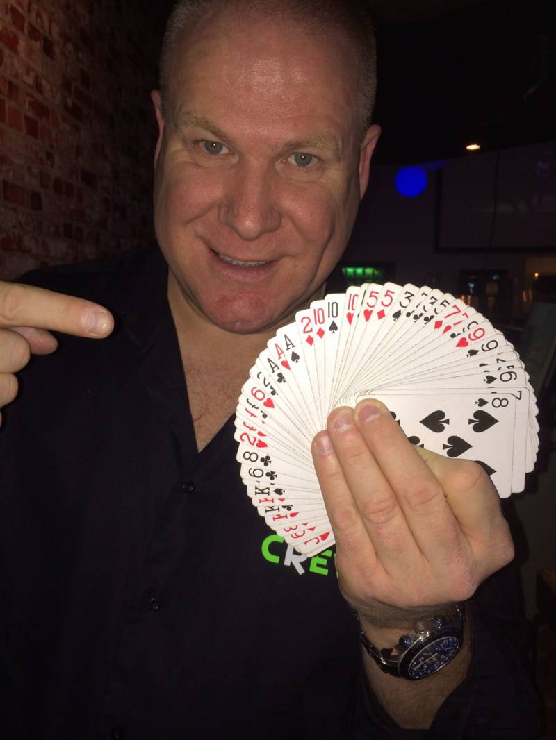 VINGERVLUGGE TAFELGOOCHELAAR STAAT ALTIJD TUSSEN DE LACHENDE MENSEN.